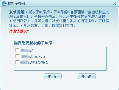 不同点2:主帐号授权子帐号(子帐号可以用主帐号的身份操作店铺,包括修改价格、邮费……)